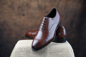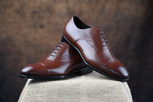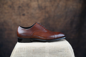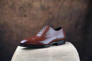 Your classic cap toe oxford, refined with Swan neck detailing and folded seam for that minimalist, seamless look. Hand lasted and 100% hand welted on our V last with French Vegano calf from Tannerie d'Annonay.